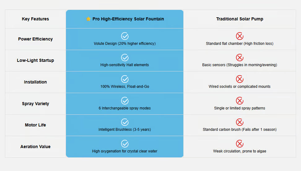 Most cheap solar pumps are "cloud-shy"—they stop the moment a shadow passes and struggle to restart. This inconsistency ruins the visual appeal of your garden and disrupts water filtration.